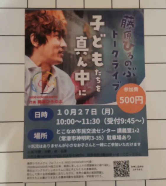 トークライブのお知らせ NGOGOODEARTH代表藤原ひろのぶさんのトークライブのお知らせです。日時:10月27日(月)10:00~11:30(受付9:45~)場所:とこなめ市民交流センター講義室1・2(常滑市神明町3-35)駐車場あり藤原ひろ…