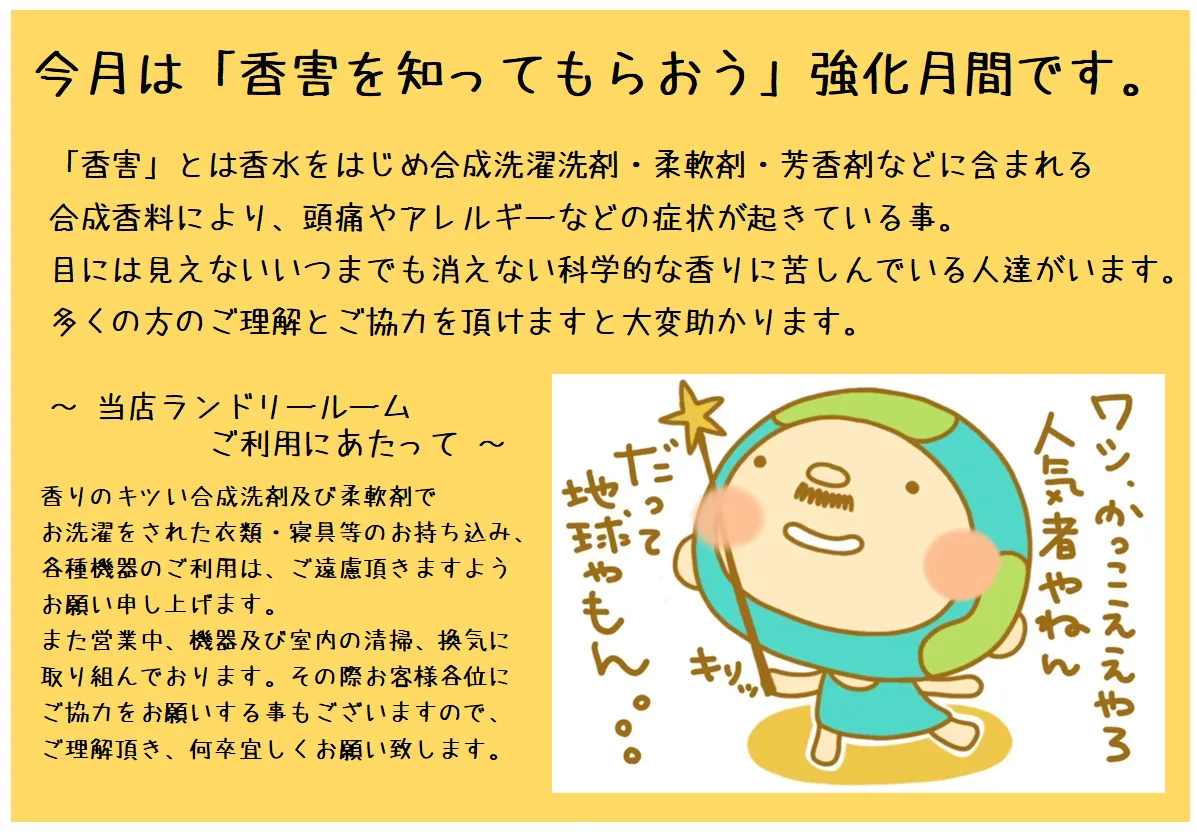 香害を公害に 「香害を知ってもらおう」強化月間です。店頭スタンド看板、ランドリールーム内外、EARTHおじさんに活躍頂いております。無添加石けんを好んでお使い頂いている方にも安心してコインランドリーをご利用頂…
